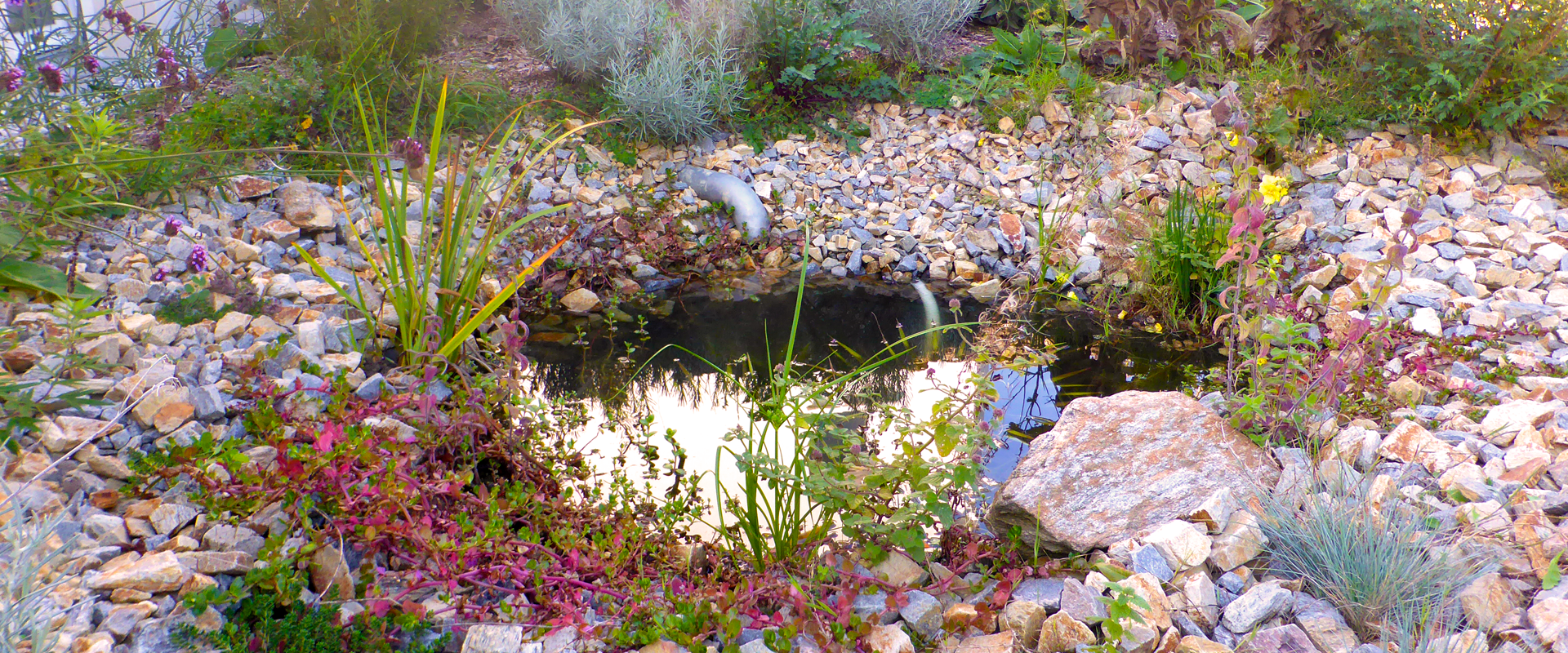 La biodiversité s’installe naturellement dans ce jardin. Le bassin attire insectes, libellules et oiseaux. Les massifs denses offrent refuge et nourriture. Les fleurs nourrissent les pollinisateurs. Le paillage protège le sol et maintient la vie microbienne. L’eau de pluie, récupérée dans une colonne de stockage et utilisée pour le bassin, limite la consommation d’eau potable. Ce fonctionnement renforce la dimension écologique du jardin et transforme cet espace réduit en micro-écosystème actif.